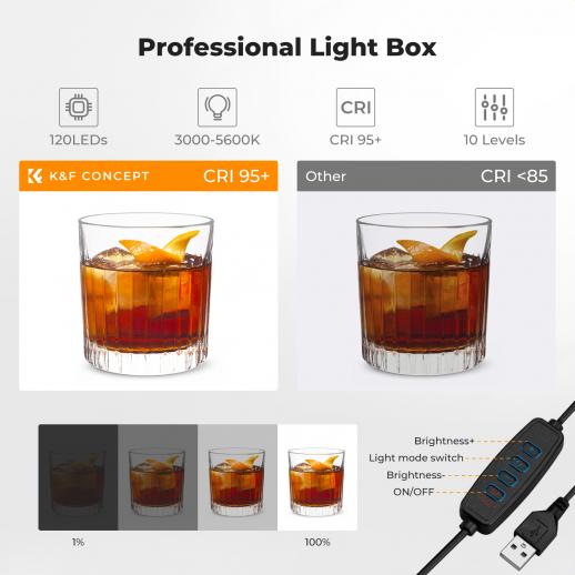 - * 【Pro-Grade Lighting & True Color (CRI 95+)】: Delivering 12W of power with an adjustable 3000K-5600K color temperature, this studio box ensures flicker-free, consistent light. The high-reflectivity interior eliminates harsh shadows, while the CRI 95+ rating accurately restores true colors and textures for professional, high-texture product shots.