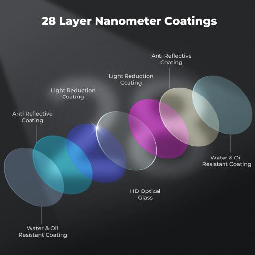- * [True Colors & Crystal Clarity]: Crafted with premium AGC optical glass and 28-layer nano-coating to minimize reflections and glare, ensuring your images stay sharp and color-accurate.The multi-coated, scratch-resistant surface repels water, oil, and dust. Easy to clean and built for long-lasting durability on all your adventures.