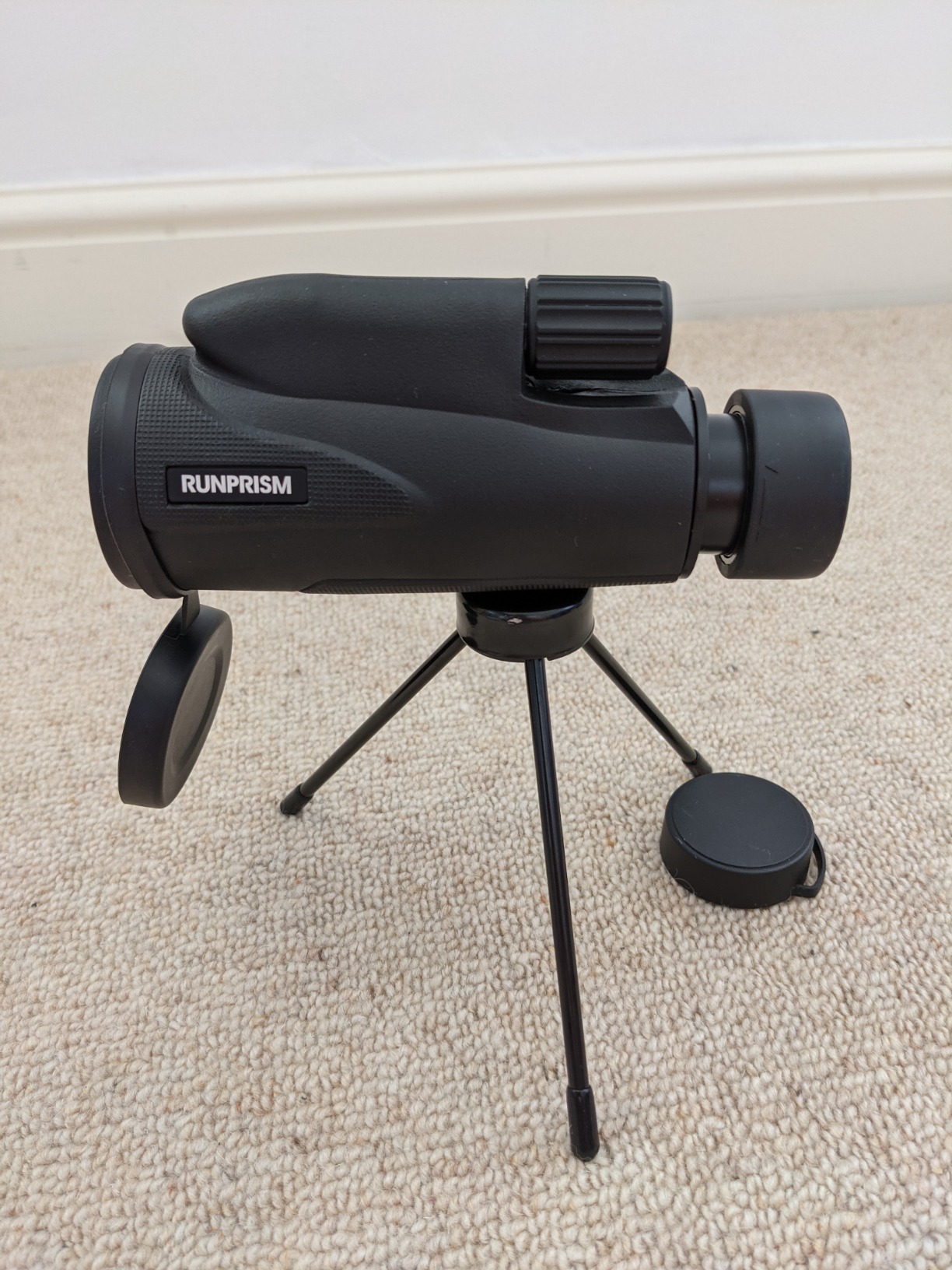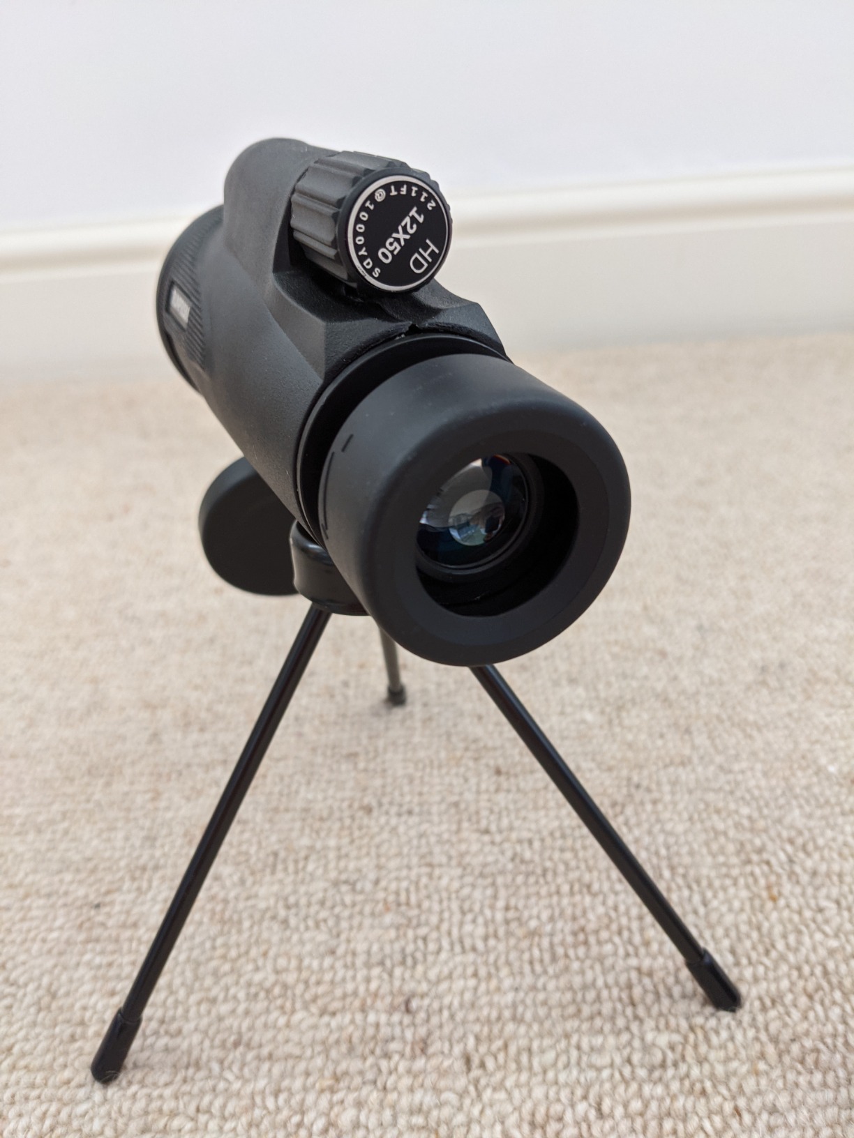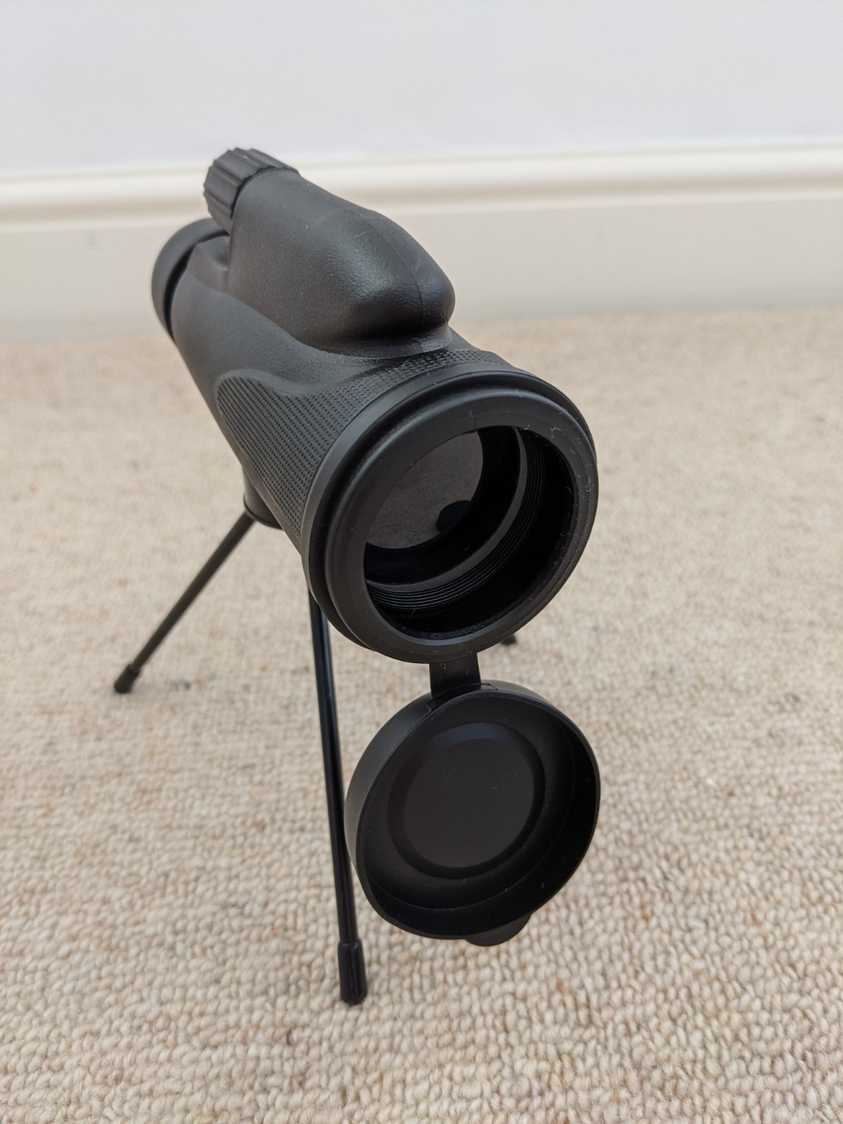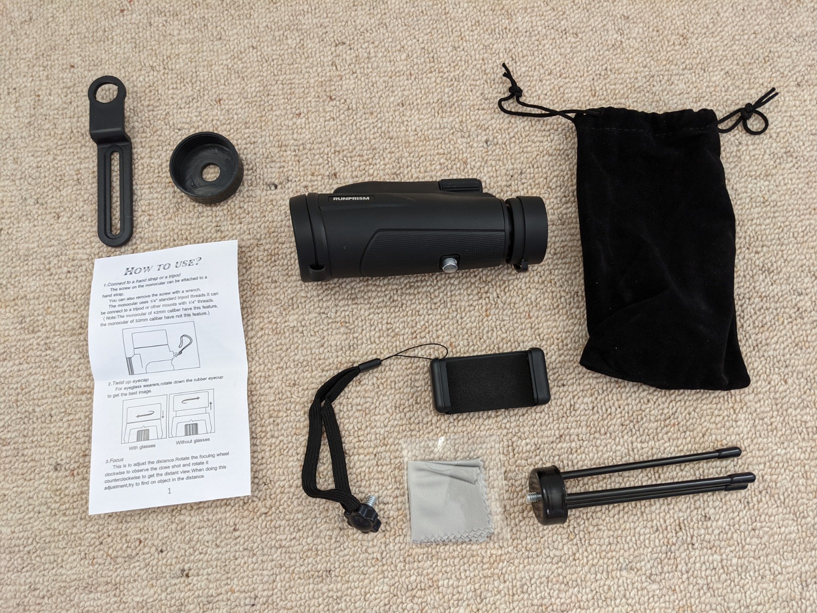 For a low cost compact monocular this is good value. It comes with phone attachment (for viewing/taking photos on your phone), mini tripod, carry pouch and hand strap as extra accessories.The monocular feels comfortable in the hand, with a smooth focus wheel and twist out eye cup and has a rubber coating for all round protection against knocks.The magnification is 12x (eyepiece) with a 50mm objective lens to give a reasonably bright image. The phone attachment is a handy extra, but most phones will have a decent zoom and lens quality to match, or exceed, the one here.Looking through the monocular reveals a good image, free from edge blur and fringing which is often found on lower cost binoculars/monoculars. The image here is clear from centre to edge.For a low cost optic, this is a great value monocular.