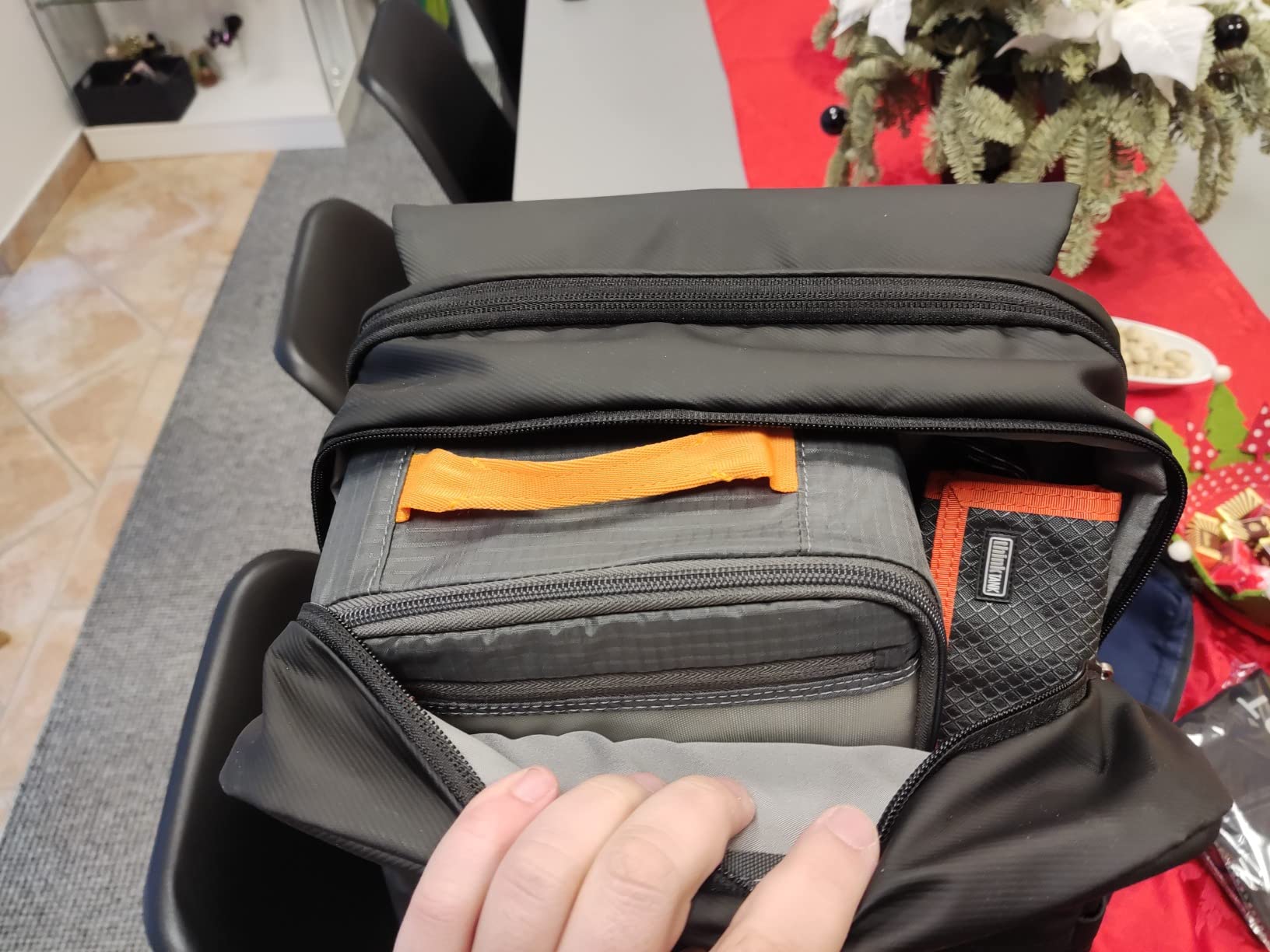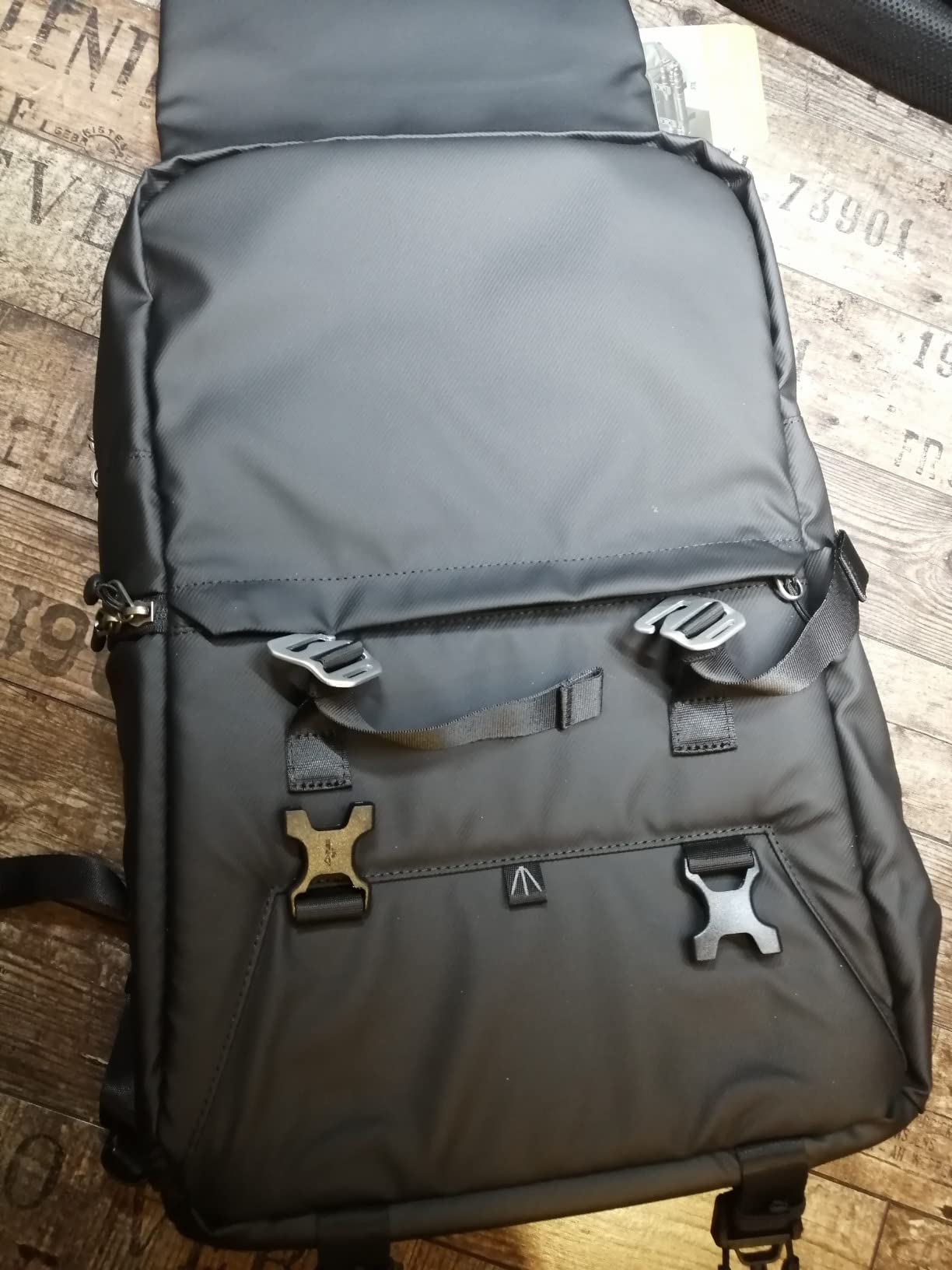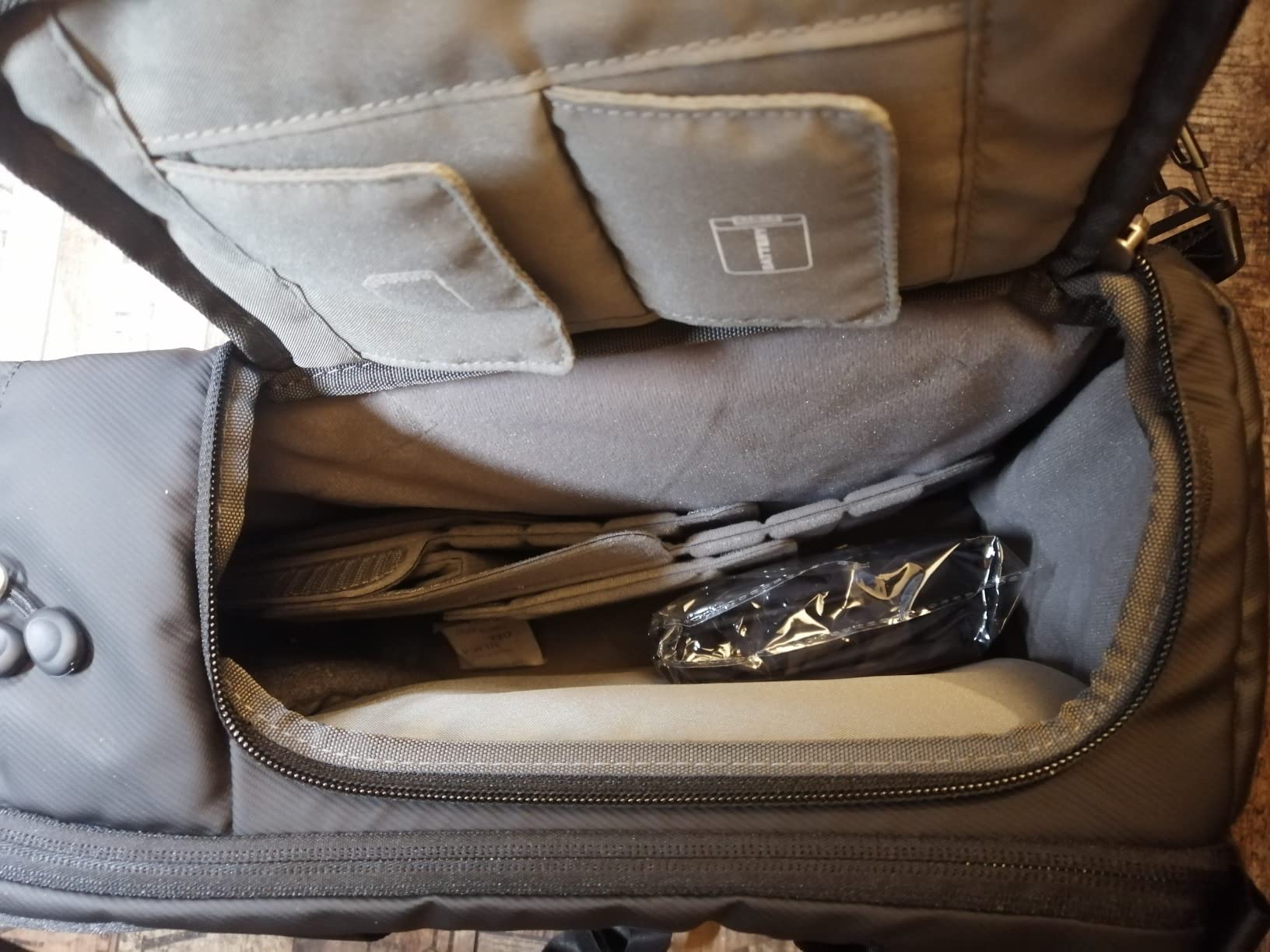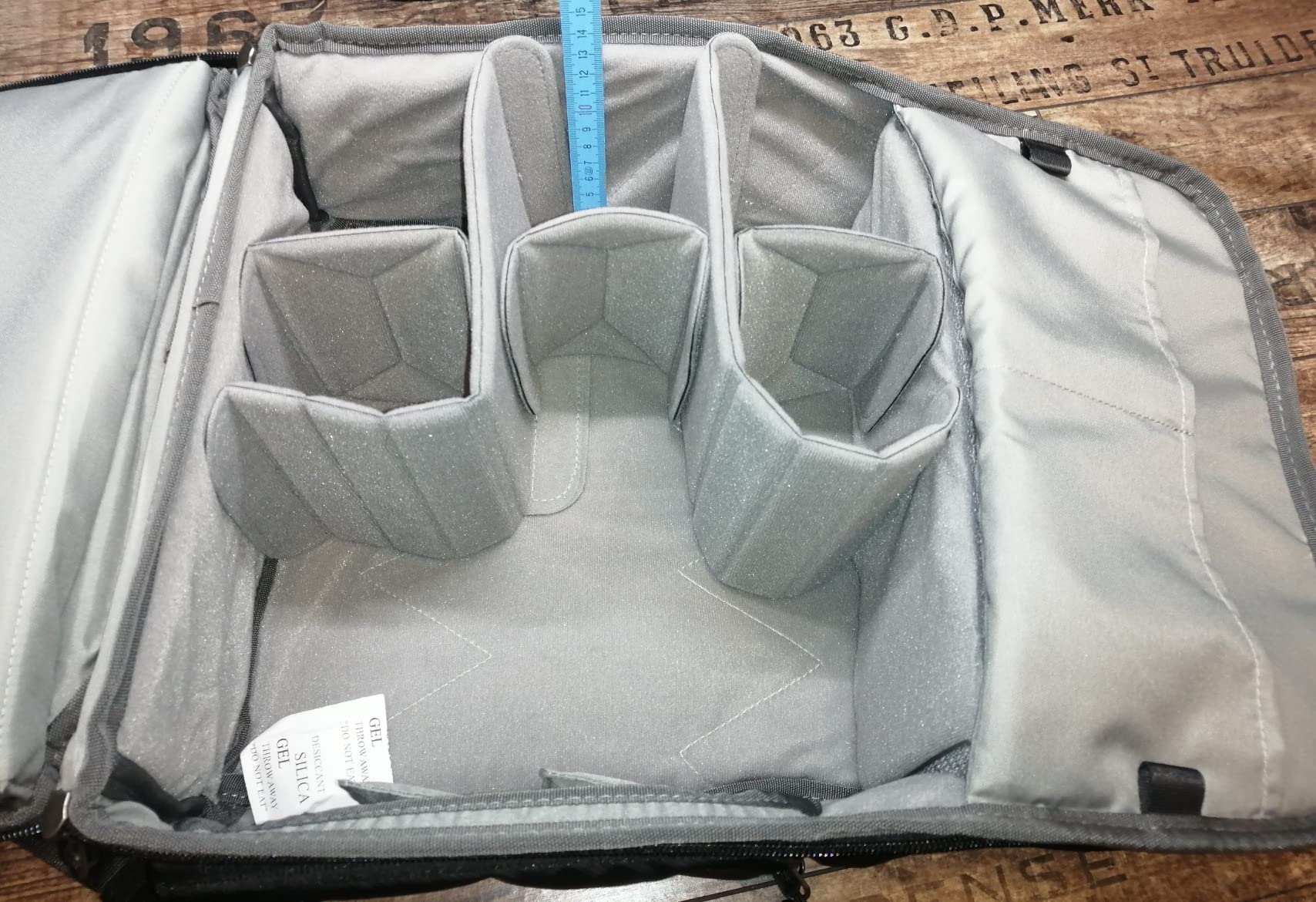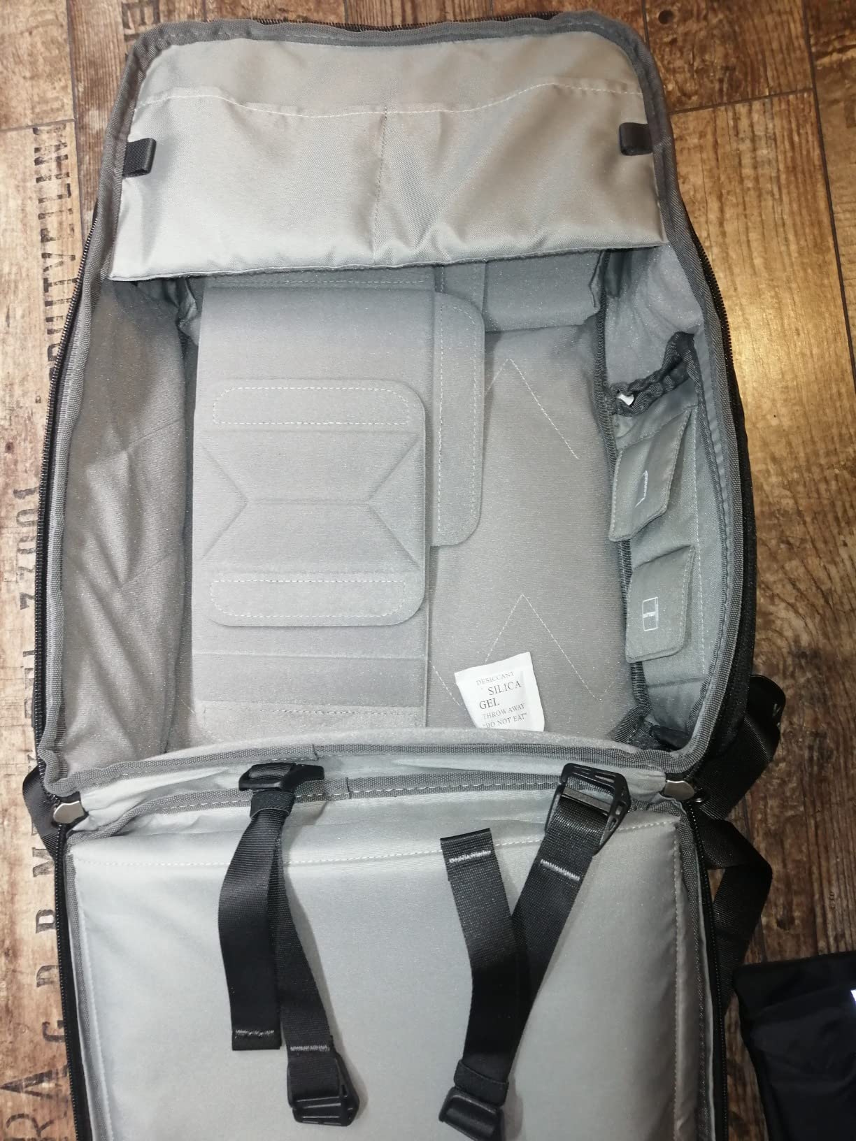 First I must start with the package:It comes in very good shape, protected by nylon and cardboard box. After I unboxed it, I started to play with it.Top department:On top I set my small bag with batteries and charger and since there was enough place left, I attached my sd card pocuh so they are always close to my hands.Bottom department:Bottom department I set camera with 17-28mm to be accessible from a side pocket, where I got enough place for two more lens (24 & 85mm), all my daily use ND filters and microphone at the bottom.All in all I'm seeing this bag as a big potentional for the price and I might start even use it as my daily camera backpack since all necessary gear gets in it.