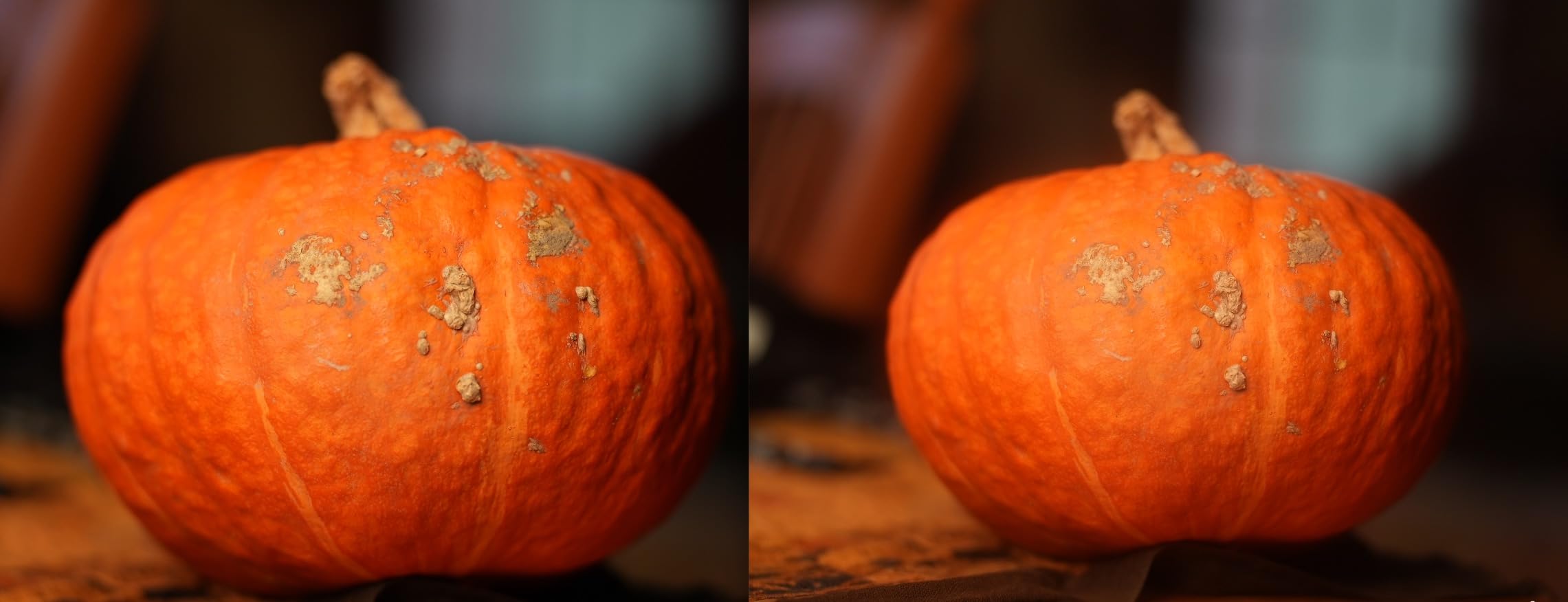 It's not the same as taking a picture of a person (unless you know someone with a deep orange complexion), but because of this punkin's slightly rough "complexion," you can see that those imperfections are dialed down just a bit. If this were a human face, it might be just enough to cover up any of the small marks that seem to be highlighted by razor sharp digital images.