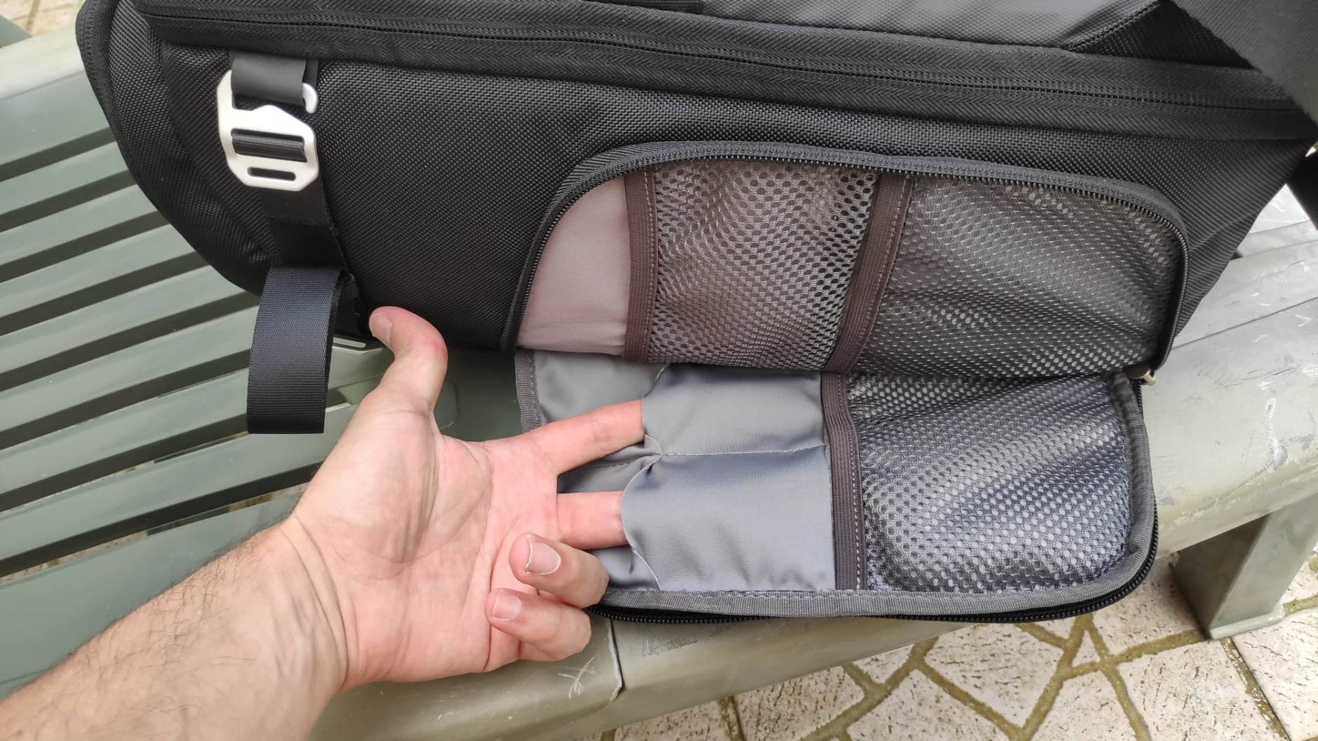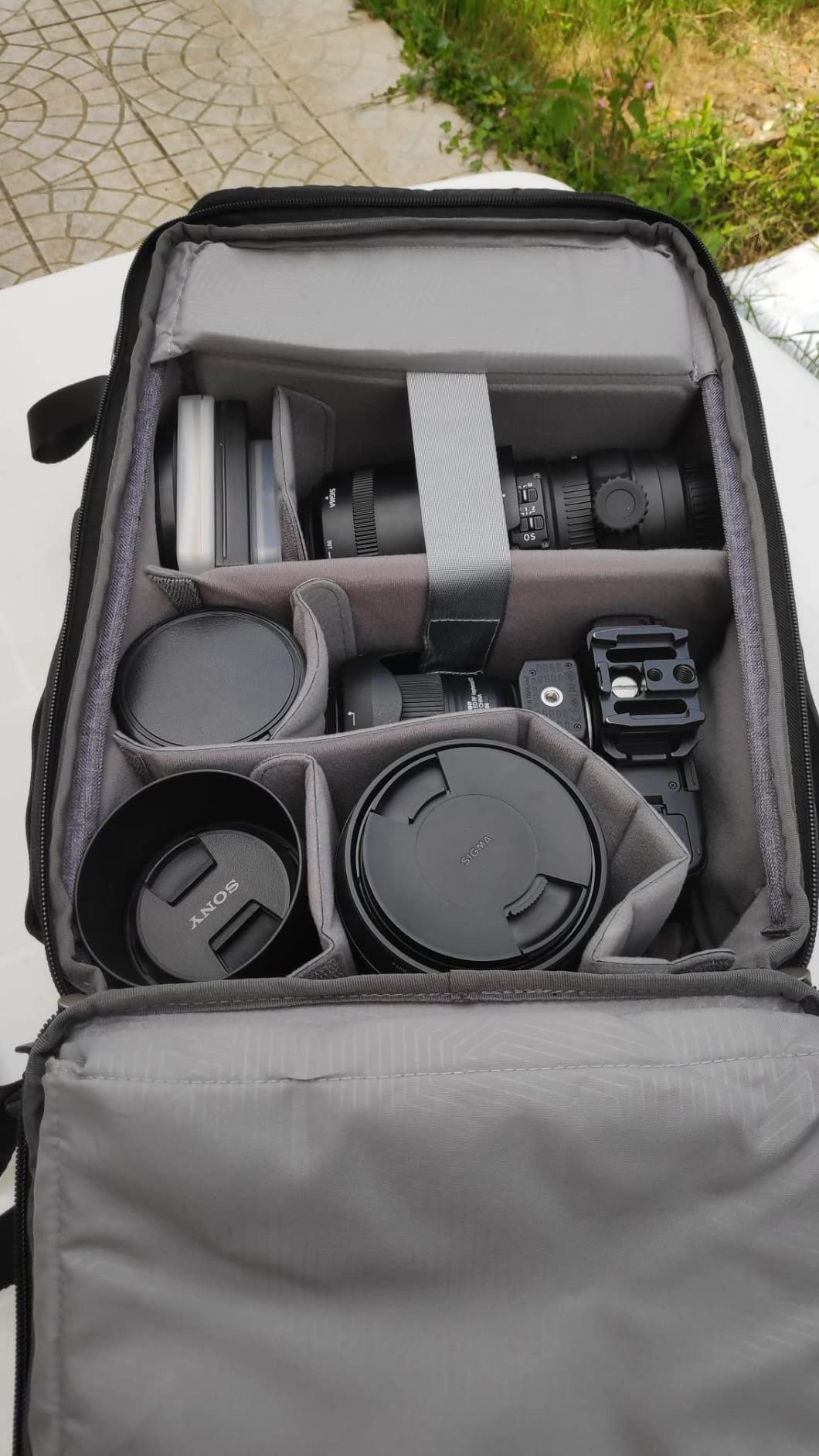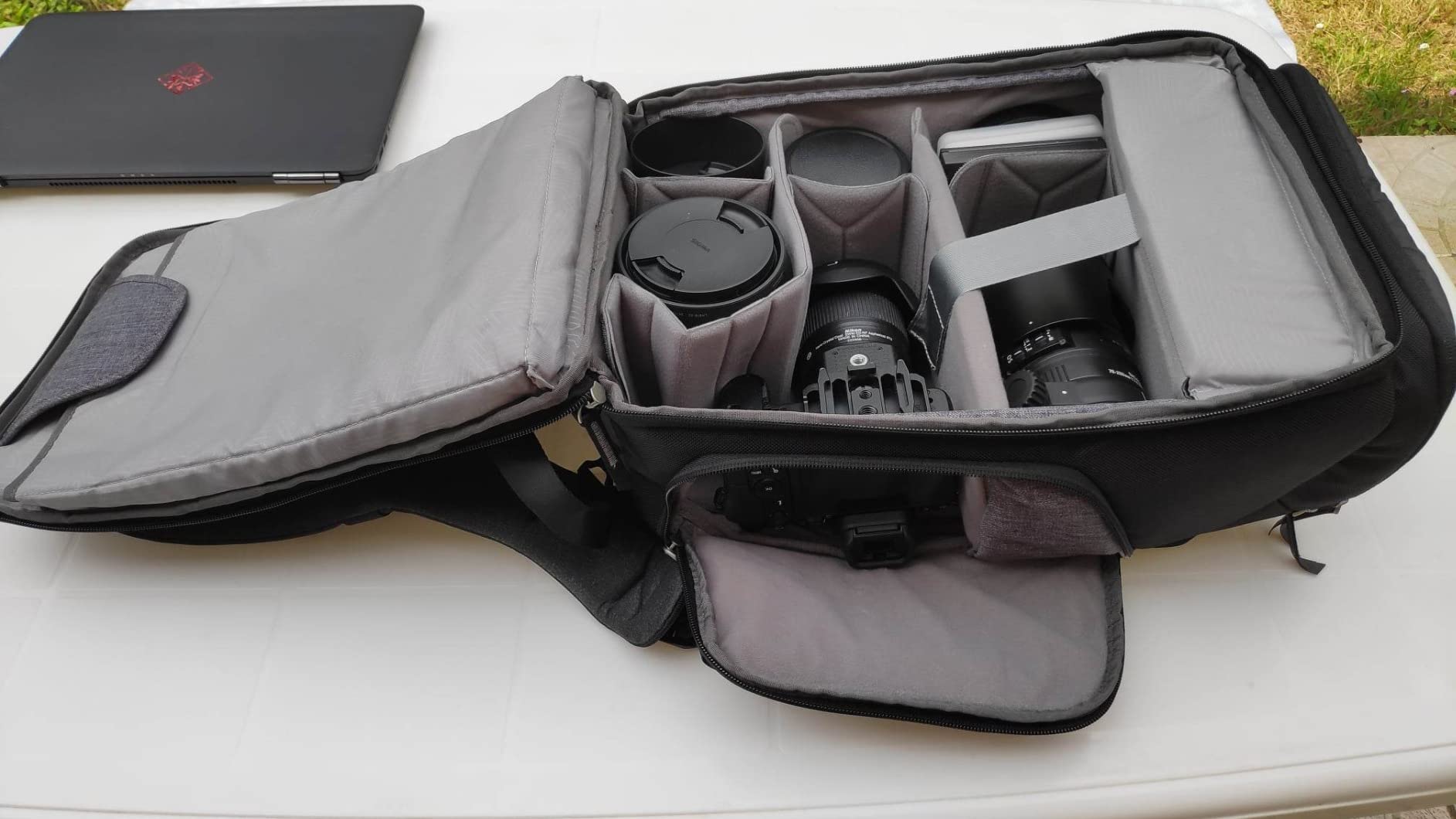 Un beau sac photo qui a vraiment tout ce qu'il faut niveau rangement et solidité. Il est aussi grand que mon ancien sac et j'arrive pourtant à mettre un objectif en plus à l'intérieur.Au départ, j'étais quand même un peu perdu, car aucune des cloisons n'est préinstallée, il faut donc imaginer sois même comment les disposer pour obtenir un rangement optimum et je me suis un peu aider des photos de la fiche produit pour ça.Ses cloisons sont bien rigides comparées à mon autre sac et c'est une bonne chose, car l'appareil photo et les objectifs ne glissent pas trop, même après une longue marche.Niveau ergonomie et solidité, il n'y a vraiment rien à dire et en ce qui me concerne, c'est impeccable ! Il a été pensé pour sécuriser le matériel. L'accès aux objectifs se fait au dos du sac et l'ouverture latérale donnant sur l'appareil photo possède une double fermeture éclair, ce qui donnera un peu plus de fil à retordre aux pickpockets pour essayer d'ouvrir le sac, notamment dans le métro parisien où l'on est souvent serré les uns contre les autres. (Des petits cadenas sur les fermetures n'auraient pas été de refus quand même.)Il y a beaucoup de pochettes de rangements, et que ça soit pour les cartes mémoires, les filtres ND, UV, polarisant, black pro mist ou autre, tout rentre ! Je peux même y mettre ma tablette graphique XP-Pen en taille M et mon PC portable de 15.5 pouces. (voir photos) Et pourquoi pas un casse croute dans la trousse supérieur et un porte monnaie...Egalement, la housse anti-pluie est vraiment bien pensée. Elle tient très bien, englobe bien le sac et ne gâche pas du tout son look. Je dirais même qu'elle peut rajouter une sécurité supplémentaire puisqu'elle recouvre toutes les fermetures éclair.Malgré tout, ce sac n'est pas parfait, et dès que je l'ai mis sur les épaules, j'ai tout de suite senti un inconfort dans le bas du dos. En effet, il a un problème d'équilibrage dû au fait que le haut de ses sangles ne soit pas cousu tout en haut du sac, mais environ 5 cm plus bas. Résultat, cela créer un effet de levier qui balance tout le poids dans le bas du dos et moi qui suis fragile à ce niveau, ça n'est pas agréable.Pour ne pas trop ressentir cette gène, je détends au maximum les sangles pour que le bas du sac appuie sur les fesses plutôt que le dos, et ça passe quand même mieux, sans pour autant résoudre totalement le problème.Bref, ce sac est pour moi à deux doigts d'être parfait ! Une V2 avec des sangles cousues à l'extrémité haute de celui-ci serait vraiment la bienvenue pour palier à ce problème d'équilibrage.