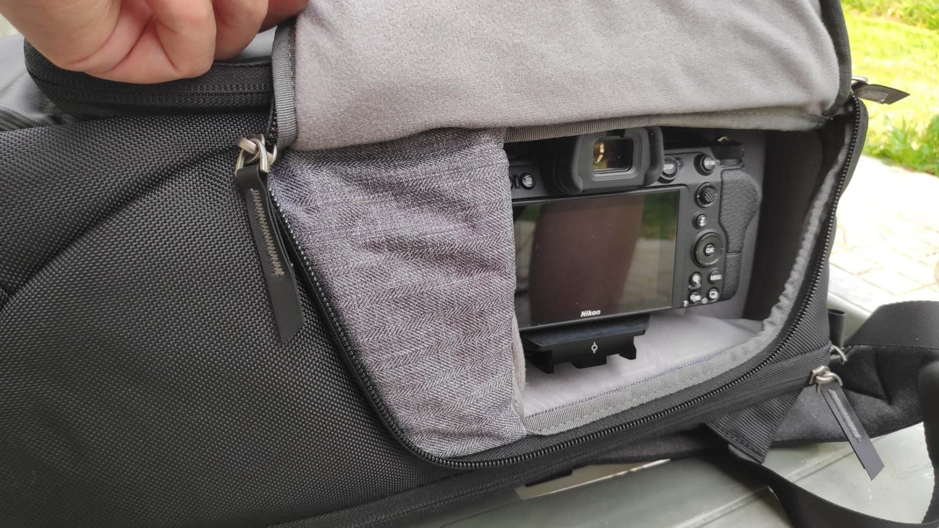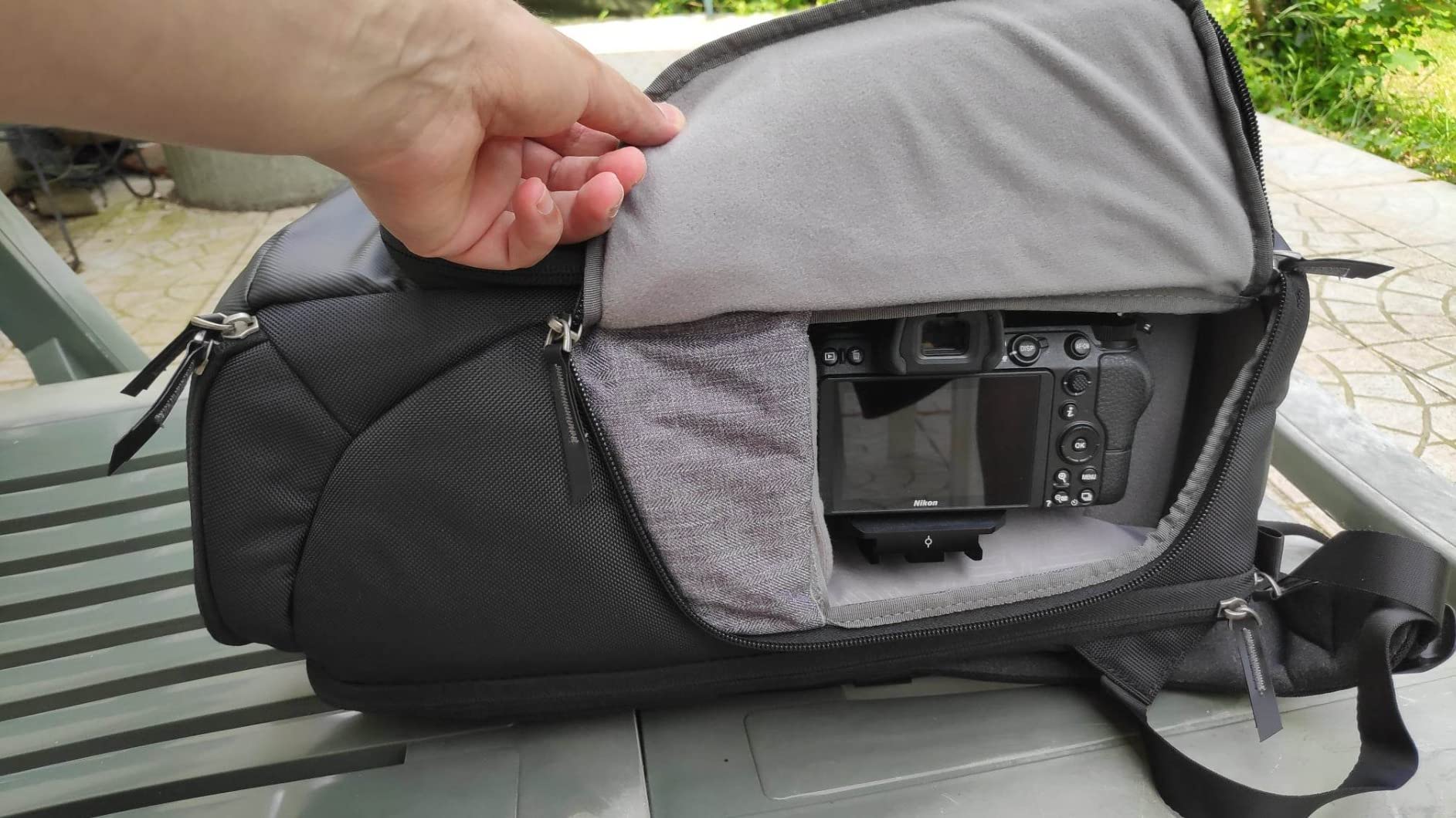 J'ai déjà un gros sac photo de 32L que j'utilise pour de la photographie animalière, mais qui n'est pas très adapté en cas de petite excursion photo. J'ai donc pris ce modèle pour transporter un volume de matériel réduit.Alors déjà, au déballage, je constate que la qualité de fabrication du sac est excellente : des fermetures zippées qui coulissent parfaitement, des textiles épais et robustes, des boucles de sangles en aluminium... L'ensemble inspire vraiment confiance !Le sac a un format assez contenu pour le volume qu'il propose, et il est très léger à vide.Comme souvent en matière de sac photo, il dispose de nombreuses ouvertures et espaces de rangement !Je trouve très bien qu'un rangement soit accessible par le dessus, il permet de ranger quelques bricoles et accessoires, et grâce à sa parois amovible, il permet d'étendre le compartiment principal du sac en fonction de la préférence de l'utilisateur ou des besoins.Un trépied de taille standard peut parfaitement s'accrocher sur le côté du sac et être maintenu fermement en place grâce aux sangles de serrage : à l'usage, pas de gène pendant les phases de déplacement.Le compartiment principal (le nerf de la guerre pour un sac photo), dispose d'un accès latéral pour sortir facilement l'appareil (dans mon cas impossible de l'utiliser, car j'utilise un Nikon D7100 équipé d'un battery grip : sans ce dernier ça passe sans problème !), et également d'une ouverture "surface complète" qui se fait côté bretelles : c'est la configuration que je préfère, car cela évite de se salir le dos si l'on doit poser le sac au sol pour prendre du matériel, et protège également d'un éventuel vol.A première vue, je pensais le compartiment un peu "juste" en taille, mais j'ai finalement été plutôt impressionné par ce que j'ai pu y rentrer ! A savoir que je n'ai pas étendu (cf photo) l'espace principal en retirant la cloison du rangement supérieur.J'ai pu rentrer :- Mon nikon D7100 avec battery grip monté- Un objectif 18-105- Un objectif 35 mm- Une gro pro avec ses fixations et leur étui- Un drone DJI Mini deux avec sa radio-commande, son étui de charge de batteries et 3 batteries- Une boite contenant des cartes mémoires et batteries pour l'appareil photo- Quelques petits accessoiresPour autant, et même avec tout ce matériel, il reste de la place dans le sac, et je n'ai pas eu besoin de solliciter les autres rangements !Dans une autres configuration, et cette fois en retirer le séparateur supérieur, j'ai été assez surpris de réussir à rentrer un objectif Tamron 150-600, qui est plutôt volumineux ! Il passe certes sans pare-soleil, et démonté de l'appareil, mais il passe !Le compartiment est bien entendu complètement personnalisable, grâce au lot de séparateurs fournis. Je les trouve d'ailleurs très bien, car contrairement à ce que j'ai l'habitude d'utiliser, ils sont assez rigide pour donner une vraie structure, et protéger correctement le matériel.A l'usage, le sac est pratique, non seulement de par sa modularité et son grand espace de rangement, mais aussi et surtout par son confort : les sangles sont épaisses, et les charges sont bien réparties, ce qui fait que malgré le poids du matériel, on a l'impression de porter nettement moins.Pour conclure, je dirais que c'est un excellent sac photo de volume moyen : il est de super qualité, spacieux, joli et discret, et pratiquement à l'usage. Je vous le recommande sans hésiter pour sa polyvalence !