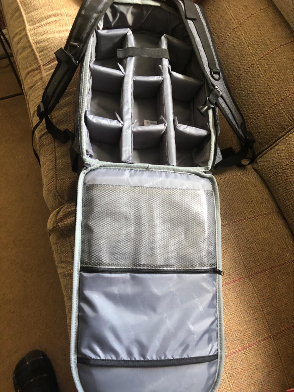 Have been very pleased with this camera ruck sack, the materials used are those of quality and the grey is an attractive colour. The camera section of the ruck sack has a large number of dividing compartments which hold all of my camera equipment very well. It has a good depth which means heavy equipment can be housed very well indeed. There is also another section for my laptop which ensures I have everything I need on my travels. The ruck sack also keeps my equipment me nice and dry as the material is completely waterproof. All in all a quality item that does the job very well indeed, very happy with my purchase.