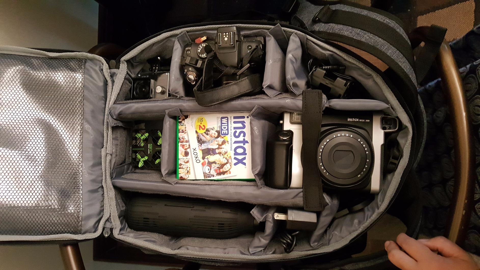 Didn't disappoint. It fits everything I wanted it to without being super bulky!Attached picture shows it holds:· Canon 7D with 24-70 lens· Canon rebel with 18-55 lens + charger· Sigma 70-200· Canon 50mm· Tamron 18-200· Ring light· Cord (in zipper pocket)(Extra batterys are in the front zipper compartment of the bag.)