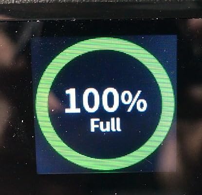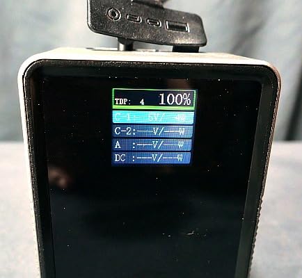 This K&F Concept 99Wh V-Mount battery has a TFT display, and without anything plugged in, pressing the activation switch on the left hand side gets it to display the current state of charge. If the battery is being used to power something, a table is displayed with the voltage and the power drain in watts, along with the current level of charge for each outlet.