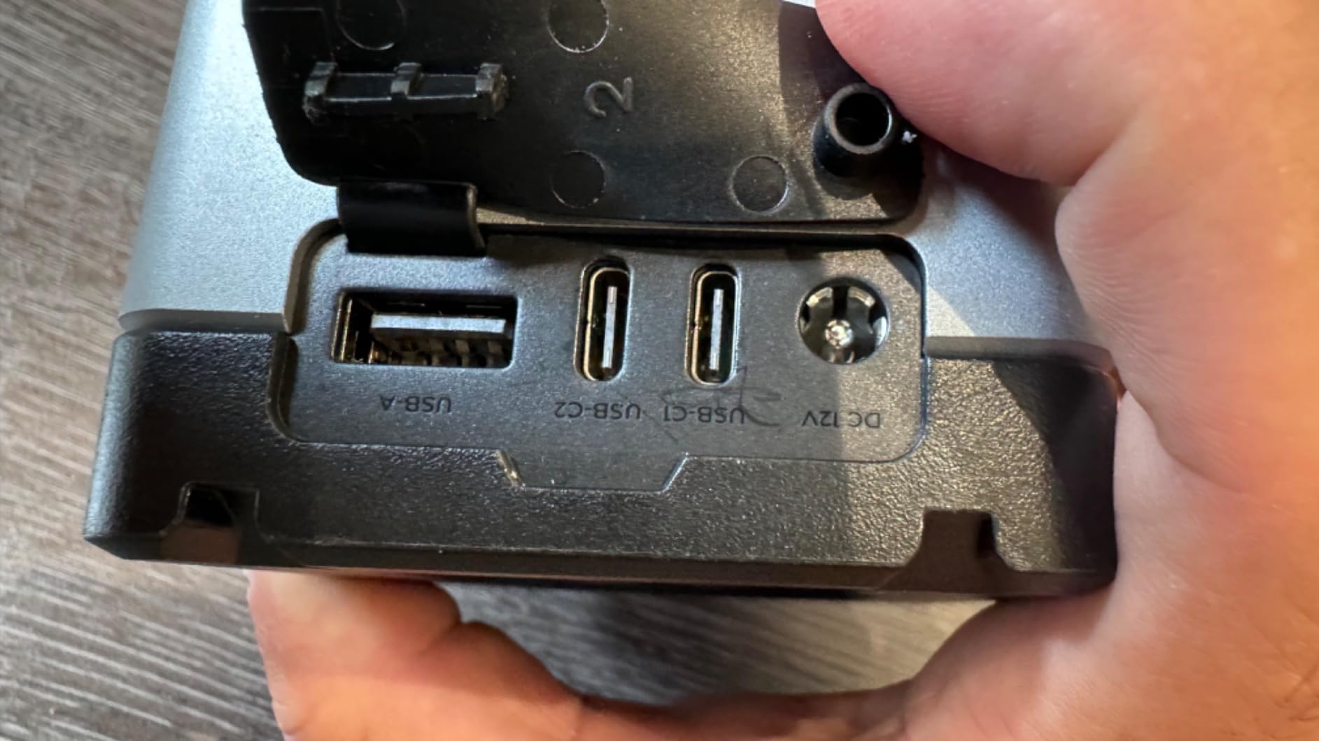 On the top are: one USB A; two USB C sockets which including super fast charging (100W); and, a 12V DC socket. The lid for the D-Tap socket comes out and is on a little rod - rotating this takes the cover out of the way. However, the top cover has a different join and it doesn't let you move it as much and as a result, it gets in the way.