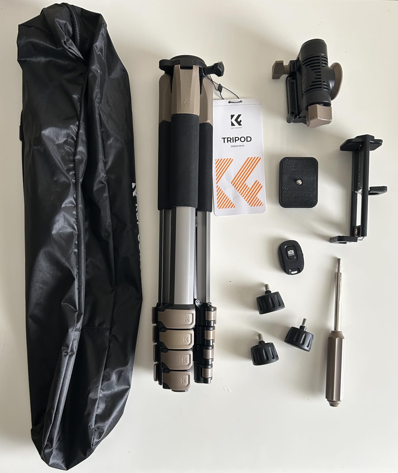 I've been using this tripod for about a month. Overall, I'm quite impressed. It is sturdy, lightweight, and extends up to 75 inches while still packing down compactly. The set includes a phone holder, camera adapter, and Bluetooth remote,