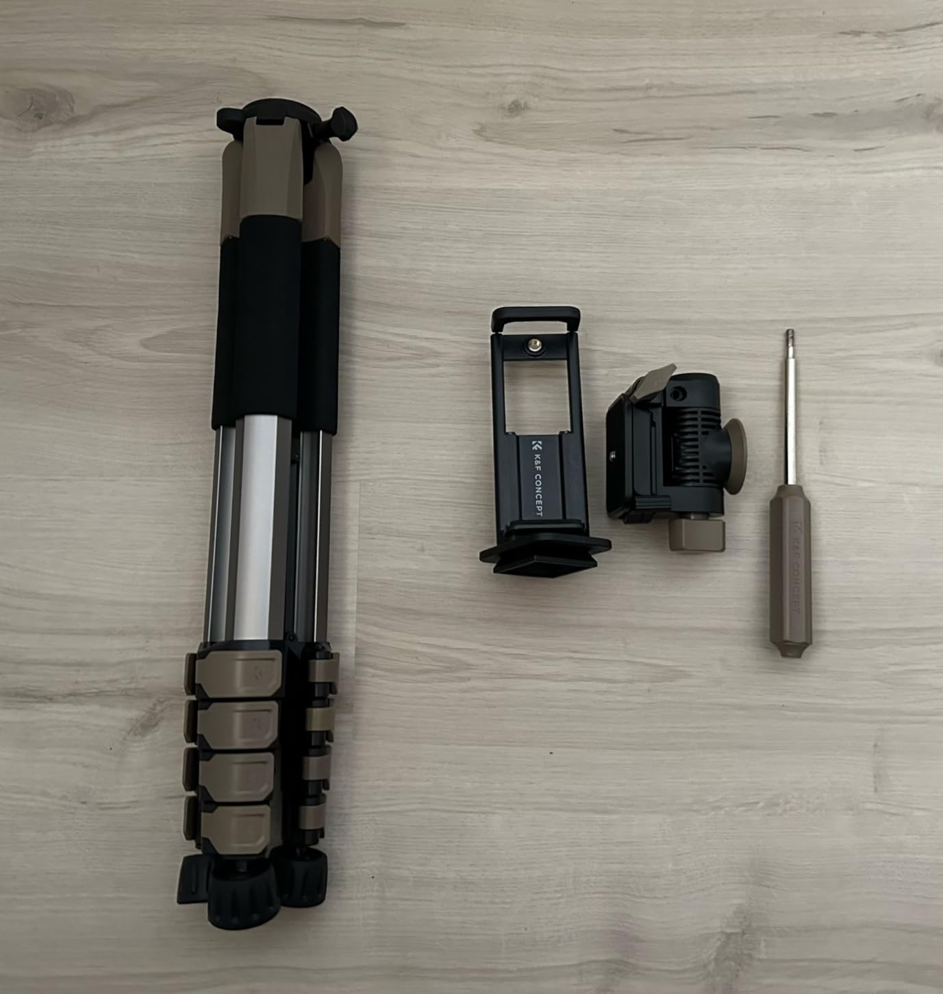 The package includes the tripod itself, two holders (one for mobile phones and tablets, and the other for the camera), as well as a practical rod that allows you to easily adjust the inclination. The camera mount can also be tilted up to 90 degrees, making it easy to use the camera in a horizontal or vertical position.
