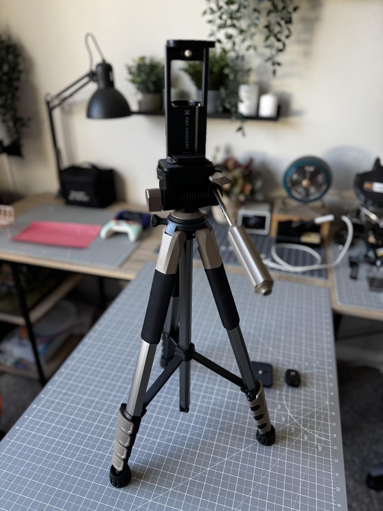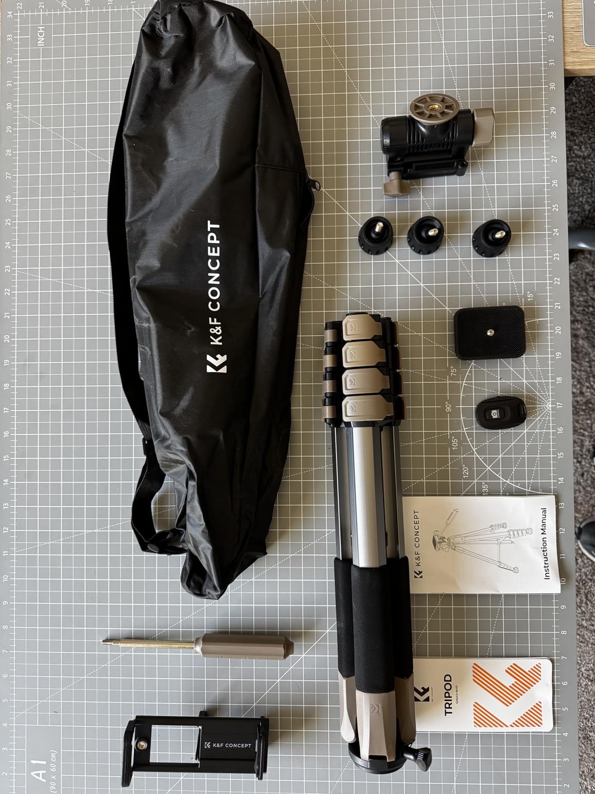 I own quite a few tripods, and am impressed with the size and flexibility of this one especially considering the low price. This one is huge! I don’t think I’d use this for my heavier gear, especially at full extension, but for lighter gear it works great. I picked up the model that comes with the phone mount as well, which is novel to be able to get it so high and FAR more stable than any selfie tripod I’ve ever seen. It’s light weight, which makes it easy to bring, but also gives it less natural stability from the weight. The legs space enough I’m not worried about it tipping in any moderately flat surface. The other K&F tripods I own are more robust, and designed for video equipment so it’s hard to compare given the major price difference and use - but it’s worth bringing up if you were expecting metal clamps and head. There is more plastic on this than those, and less head adjustability. I included some photos so you can see the size in a room with 10’ ceilings.