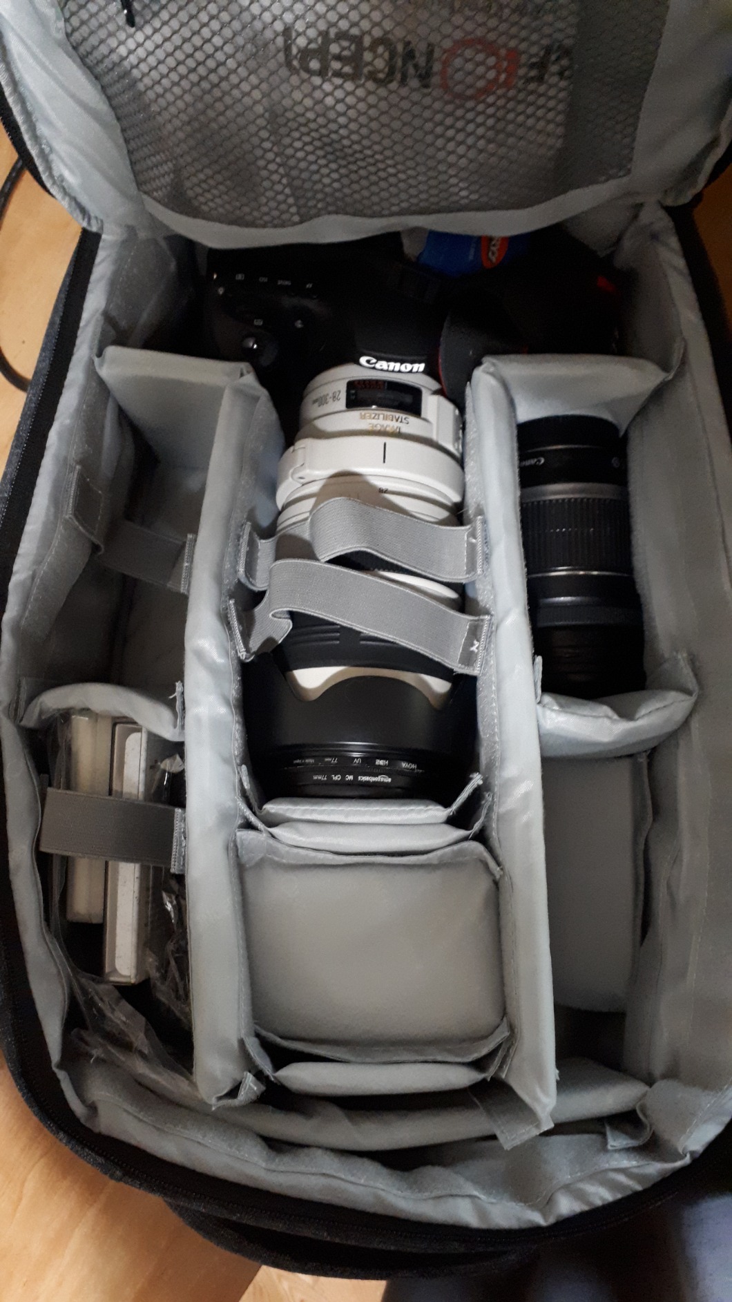I spent a long time choosing a bag for my new camera and L series 28-300 mm lens. I was specifically looking for a bag to accommodate the lens on the camera. After many searches I found this one, it arrived today and after some juggling around with the moveable partitions, I now everything organized, with room to spare for additional lenses. Even with that beast of a lens in the bag, it's pretty comfy on the back. I really like this product.